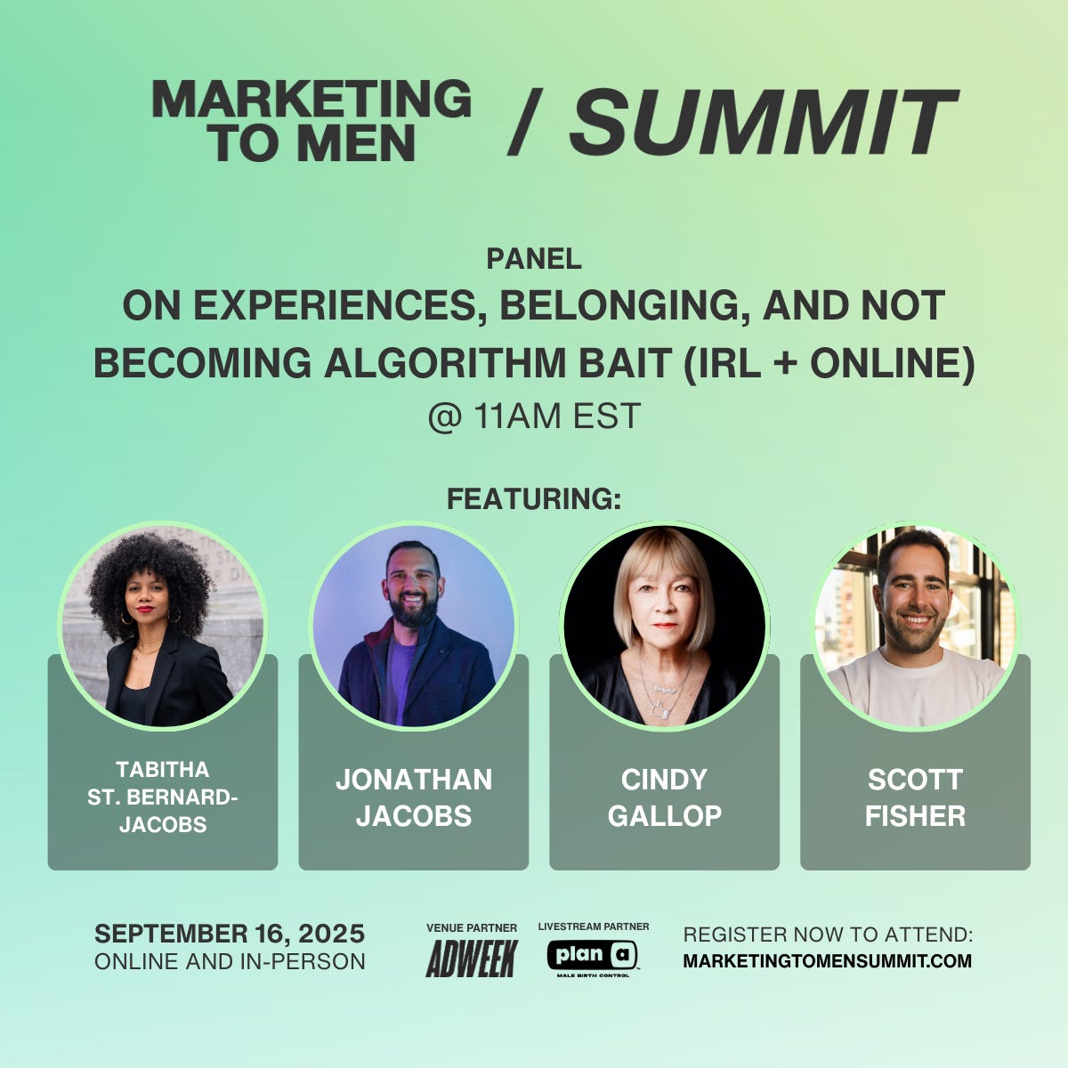 Tabitha here: I’ll be speaking about a topic really dear to me as a person who tries to strive for antiracist parenting AND who’s raising a young boy with values of healthy masculinity. I’ll be at the inaugural Marketing to Men Summit on 9/16 at 11am. The in-person seats are limited but you can register to join virtually for free here.
