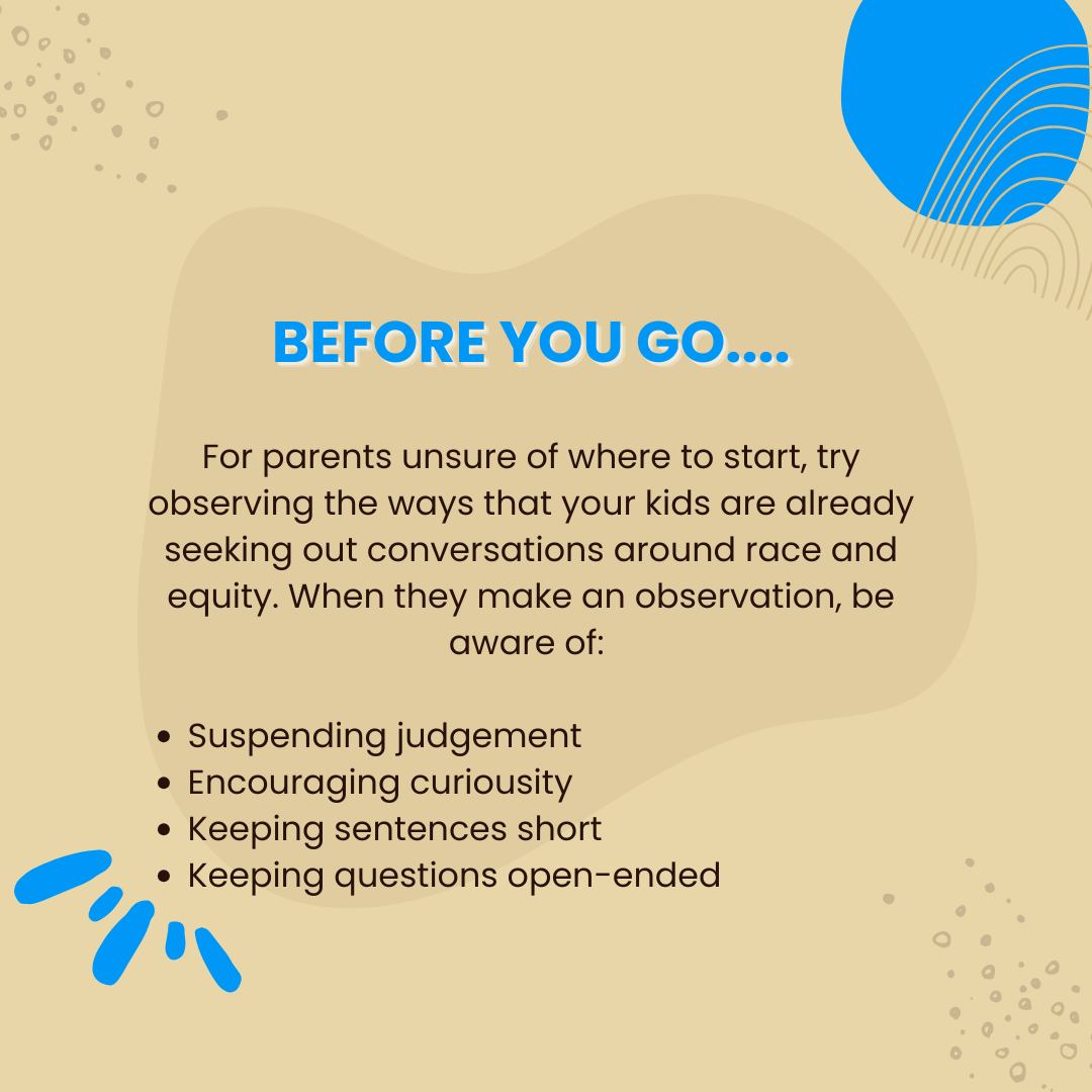 The above is pretty clear, right? Intention isn’t the same as action. And infusing antiracism into parenting takes lots of work, consistency and creativity. And, though we are all exhausted from parenting under capitalism, fascism and more, you’re here and reading this. You know we all have some learning to do (yup, even me). Below is just one actionable and simple (ish) habit you can develop when communicating with your child about race and antiracism.