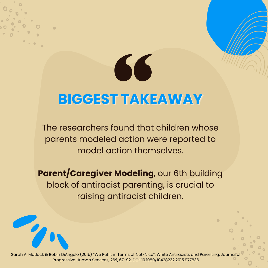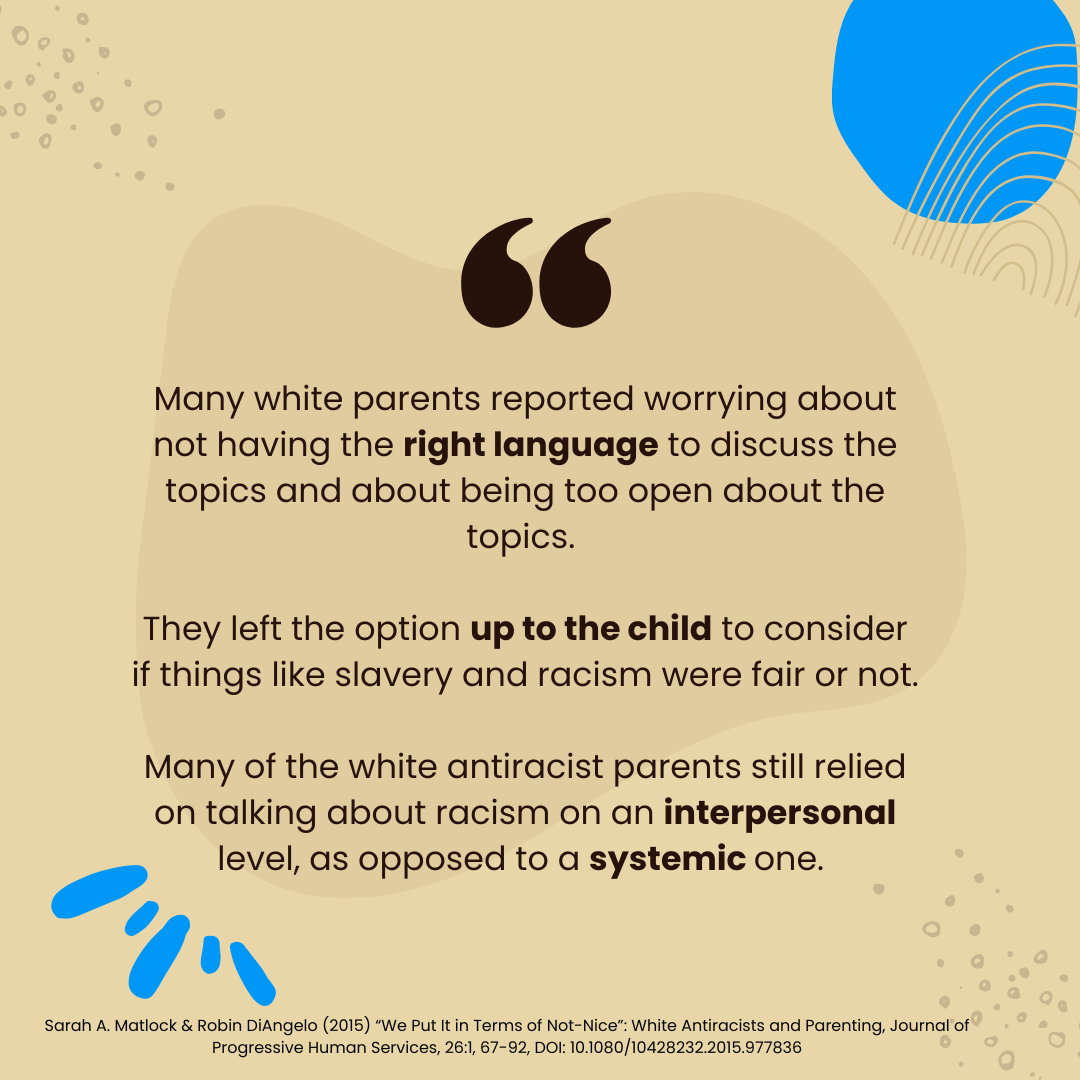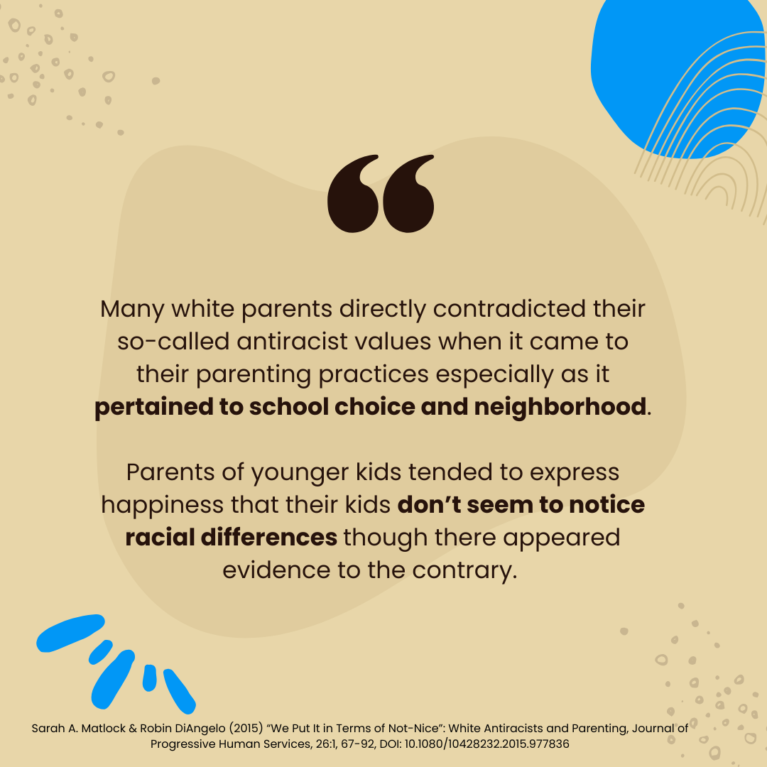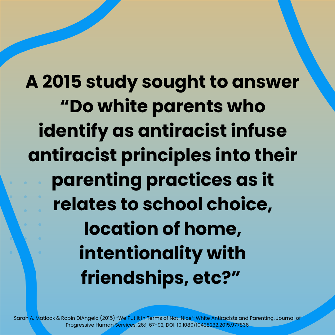 In my work, I came across a study by Sarah A. Matlock and Robin DiAngelo that struck me as so helpful and necessary for white parents on this antiracist journey. Though this study was done in 2015, it’s still relevant to this day.